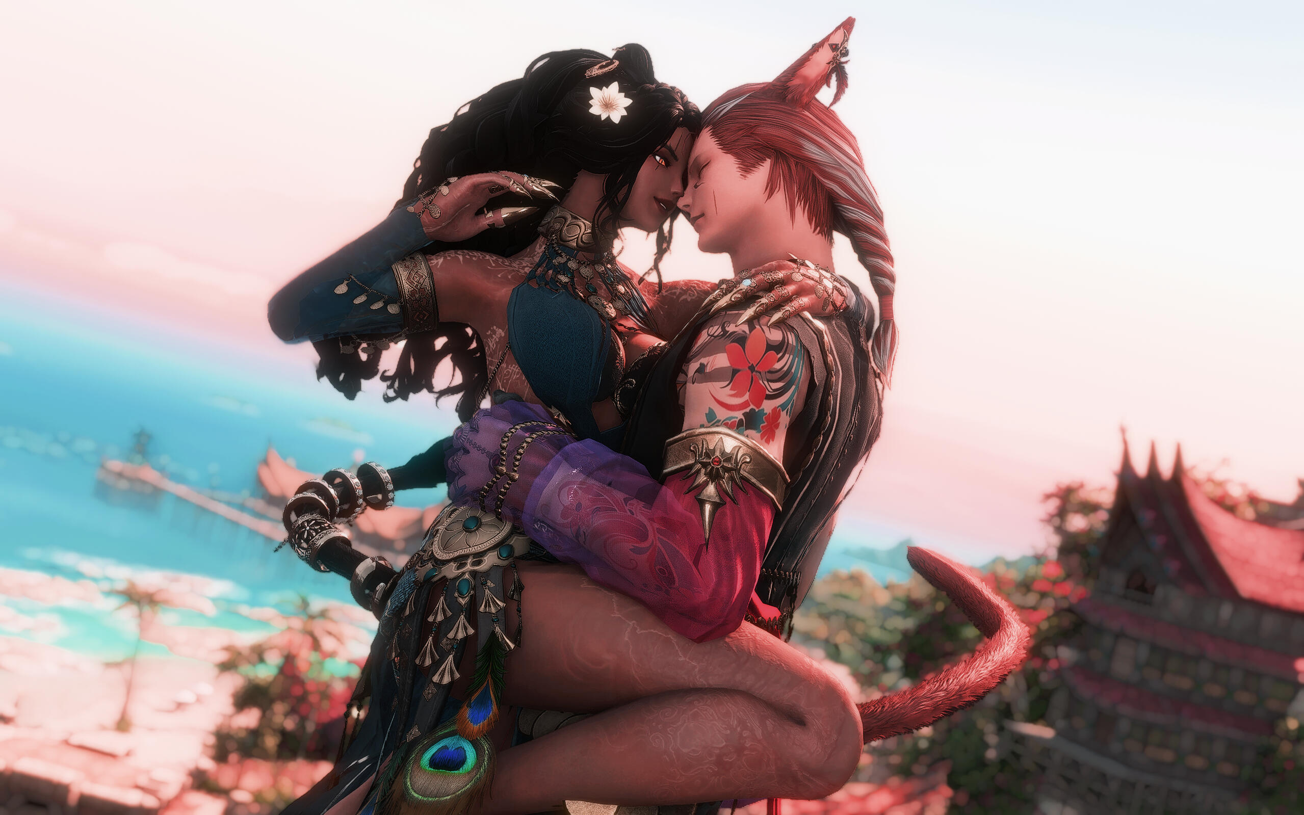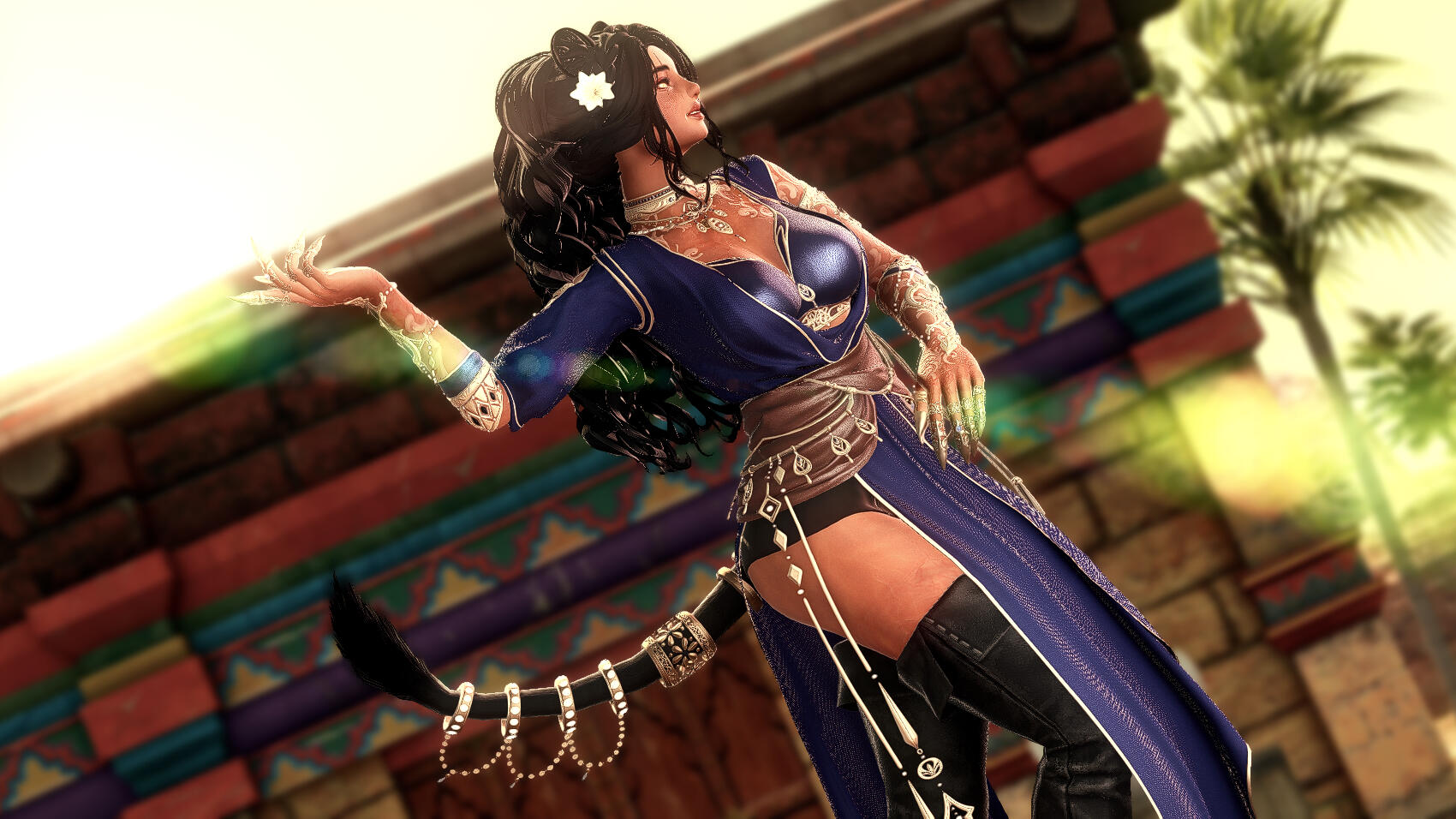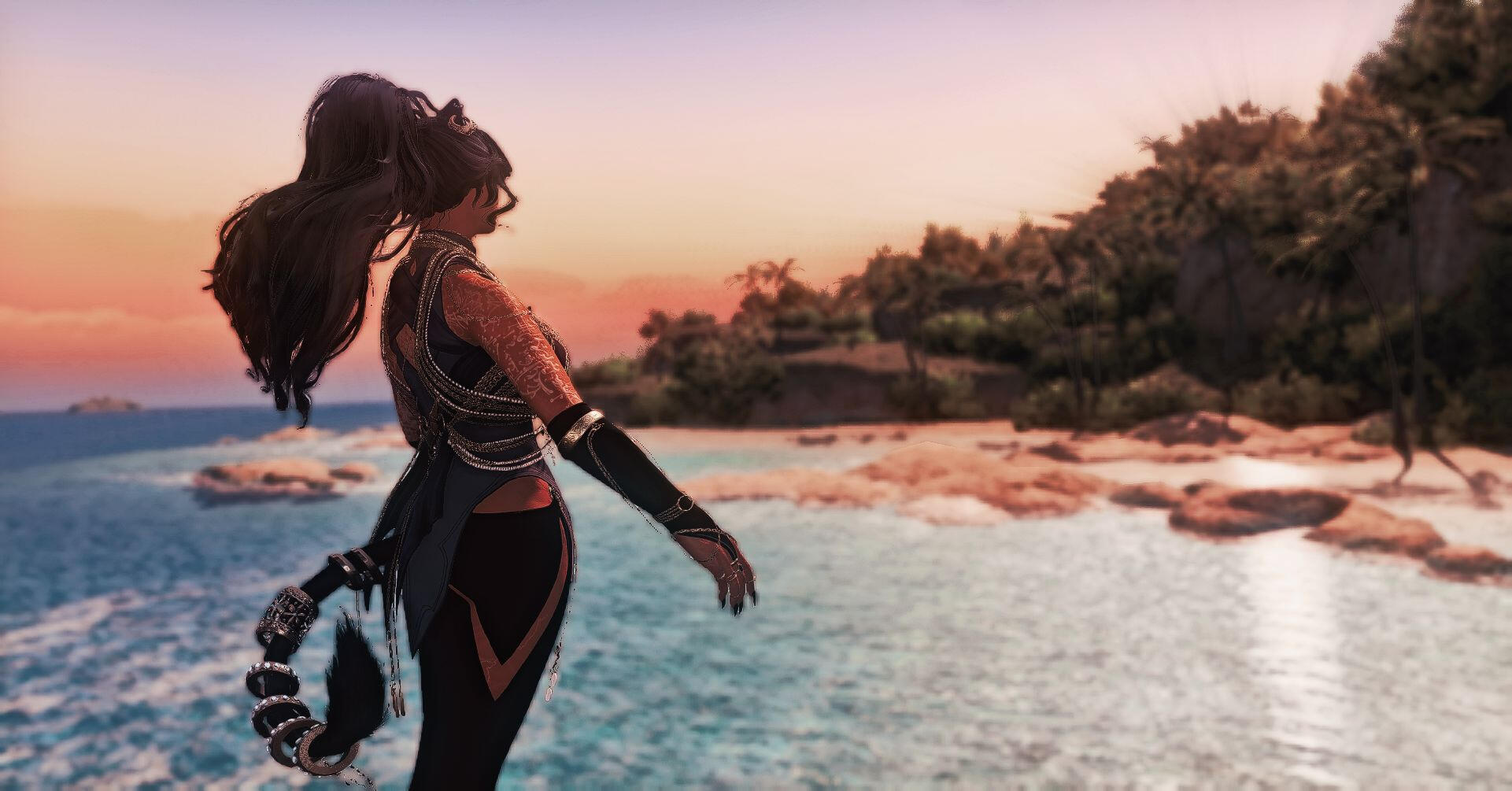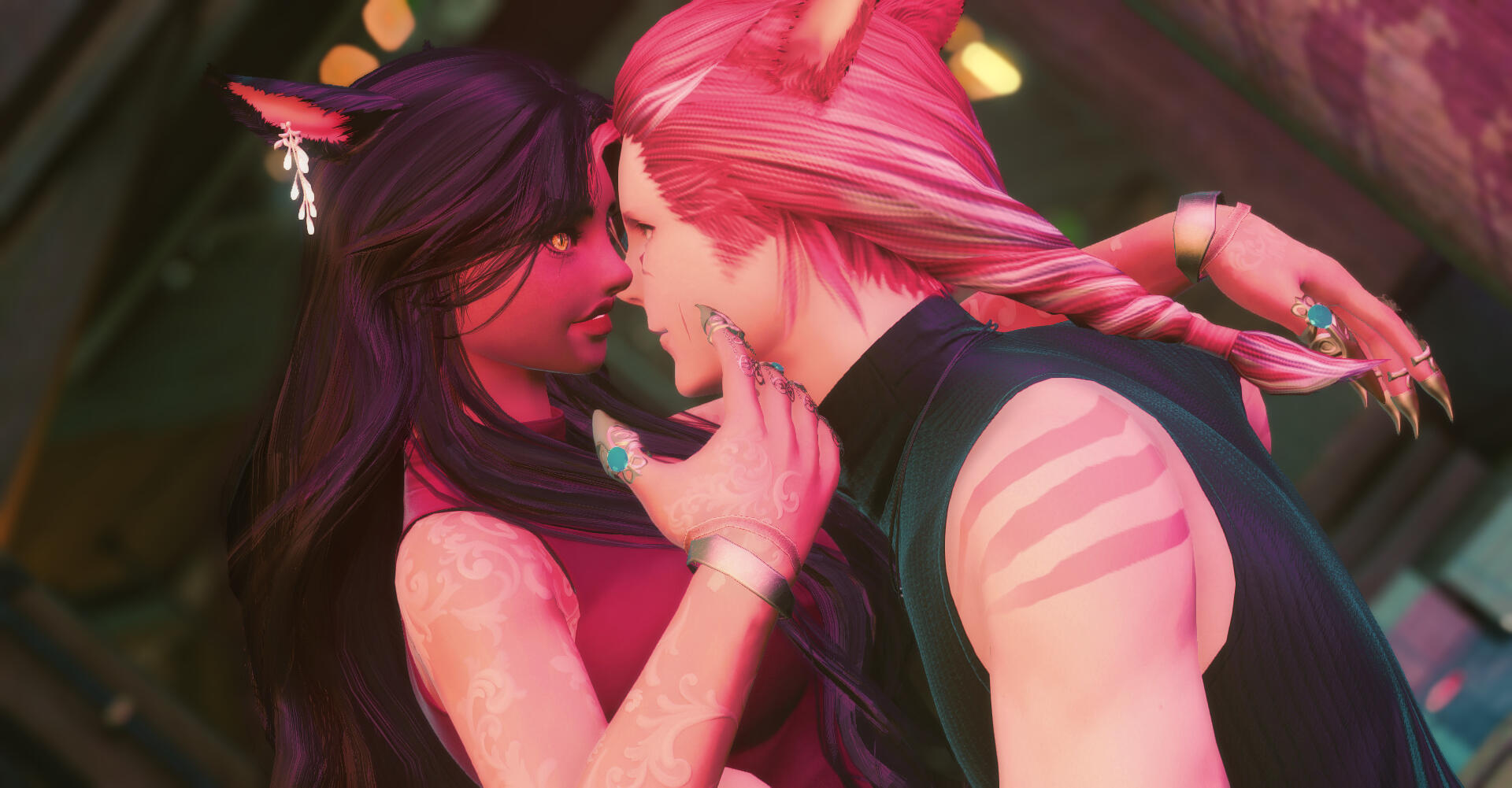Nailah carries herself with noticeable confidence most days, despite the scars she bears. Most noticeably, there is a scar from the top of her right brow till under her eye from a bladed edge. When her back is exposed, there is a notable electrical burn scar along her lower back, and burn scars along her shoulders (which are mostly covered by her new tattoos). Her hands are weathered and worn, calloused and slightly burned from training.Recently, Nailah had aether-ink tattoos added to her skin. Spanning her arms, across her collarbones, and down her back, these are based on Arcanima's principles and intended to assist with aetherflow.Beyond that, Nailah loves her jewelry. Earrings, necklaces, bracelets, and rings for her fingers, ankles, and even her tail. When she is not working, it is very easily to identify her arrival based upon the jingling of all her jewelry.